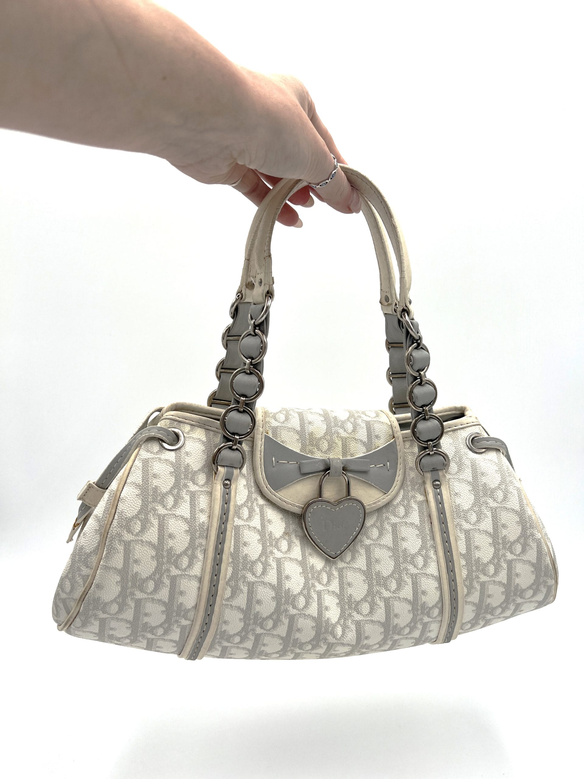 Brand: DiorThis chic Dior trotter shoulder bag, with the sweetest heart and bow detail, adds such a romantic touch to any outfit. The signature monogram patterned bag is from 2008 and comes with the authentication card. We have labeled this bag in fair condition due to its soft vintage smell, some discoloration on the canvas, and cracking on the leather.